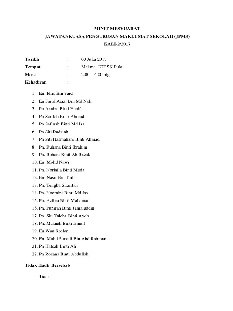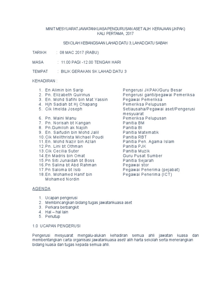 Contoh Minit Mesyuarat Aset Sekolah Senarai Contoh Minit Mesyuarat Sekolah
